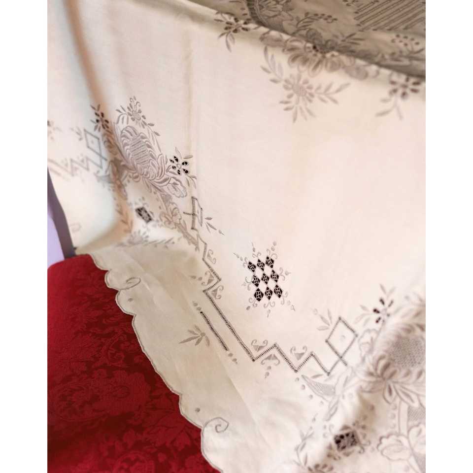 Tovaglia in Lino Avorio con Ricamo Traforato Grigio, Design Rettangolare in Raso Senza Pieghe - per Soggiorno, Sala da Pranzo, Ideale per Hotel