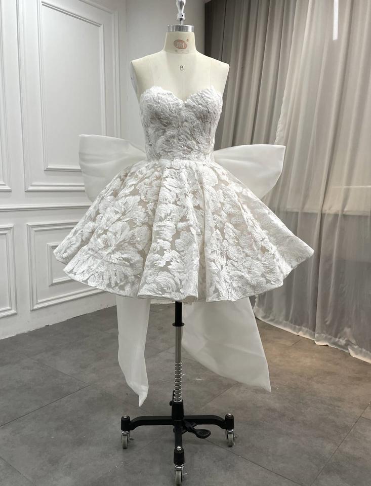 Abito da Sposa Mini Senza Spalline Color Avorio con Pizzo Floreale 3D e Fiocco Staccabile sul Retro per Feste Nuziali ed Eventi di Fidanzamento