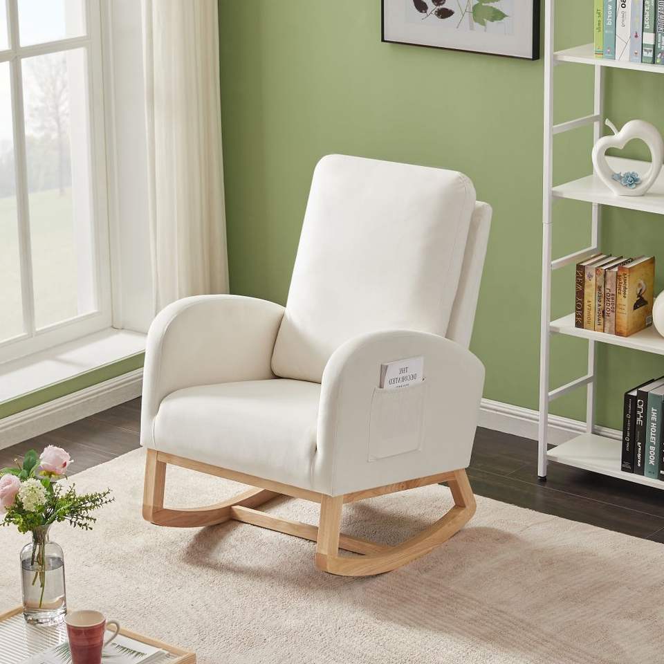 Poltrona a dondolo JA505 in velluto beige con organizer per soggiorno