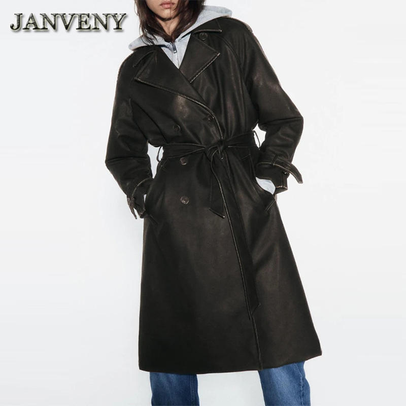 JANVENY 2023 nuova primavera autunno Trench in Pu di media lunghezza da donna Vintage doppiopetto con risvolto stringato giacca in finta pelle