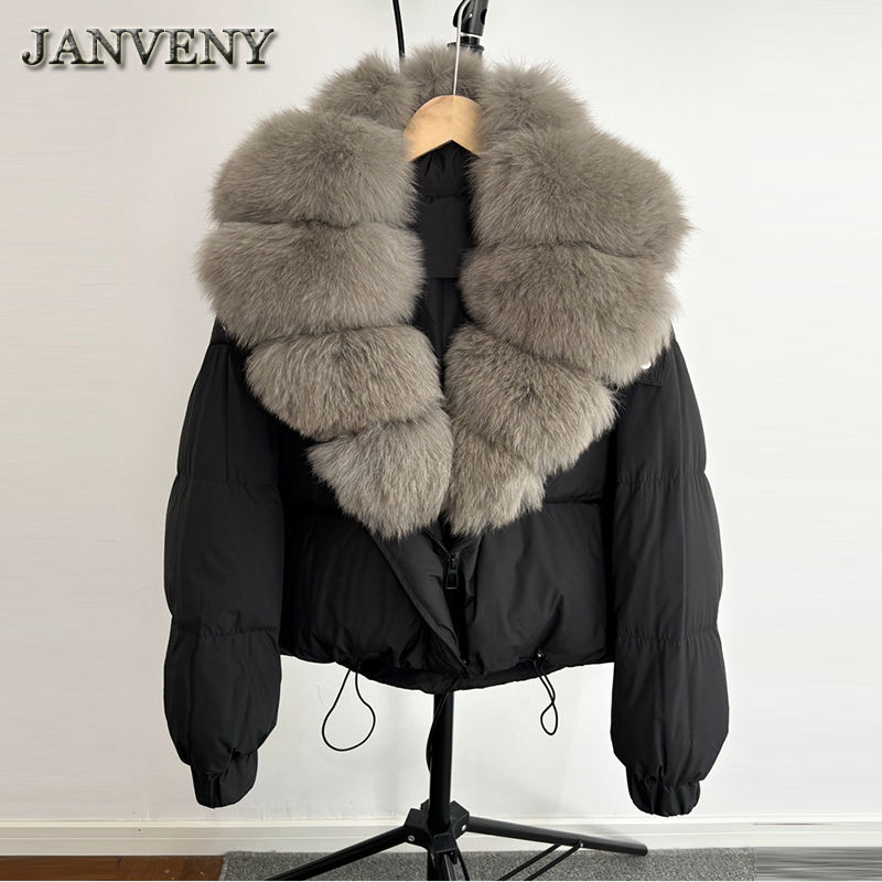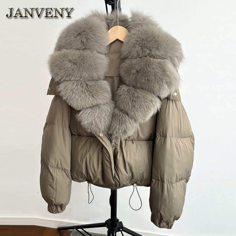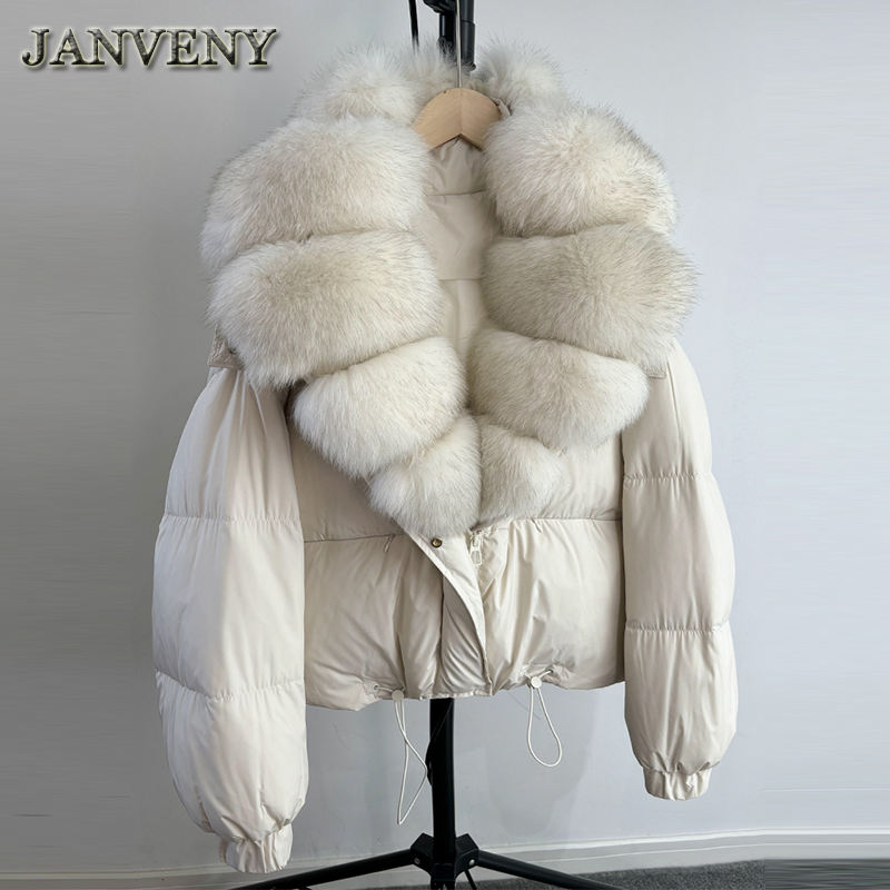 JANVENY 2024 Giacca Invernale Imbottita con Cappuccio in Vera Pelliccia di Volpe, Cappotto Corto da Donna in Piumino d'Oca Bianco, Caldo e Spesso