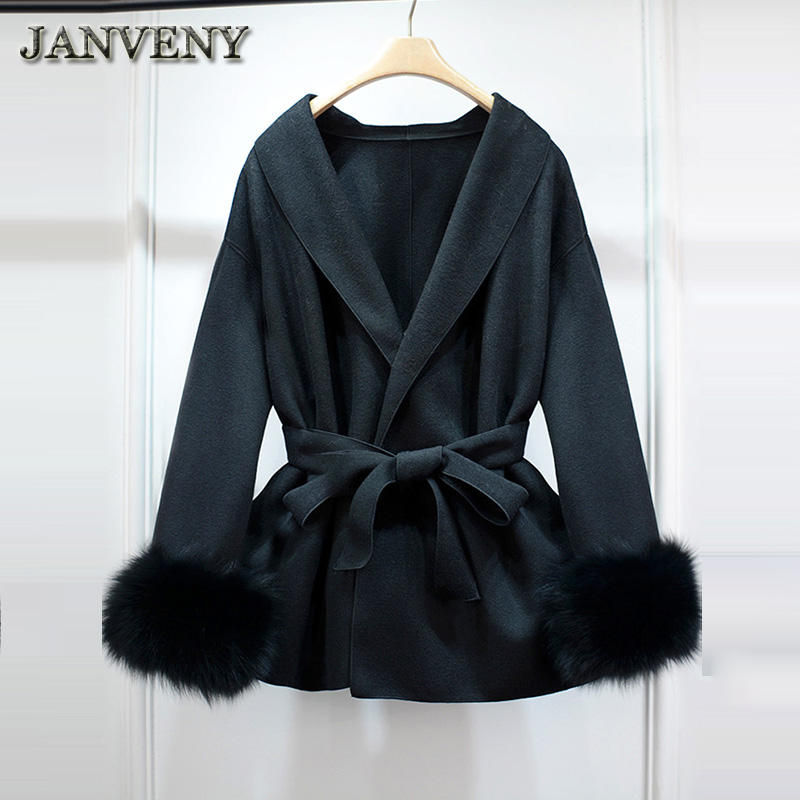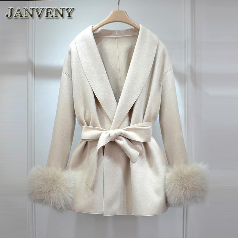 JANVENY Winter Medium Length Cashmere Jacket for Women Real Natural Fox Fur Stitching Sleeves Lapel Solid Color Belted Wool Coat
