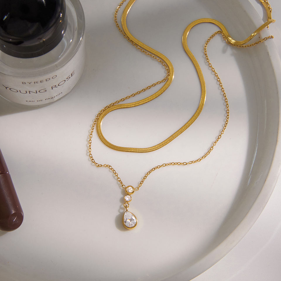 Collana JD Moderna a Doppio Strato con Catena a Maglie e a Lama Placcata in Oro 18K con Pendente a Goccia in Zirconia