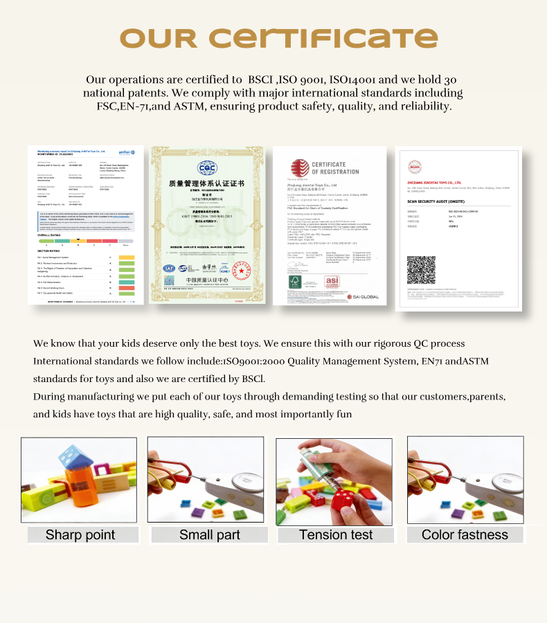 Certificate:BSCI FAS ISO9001 ISO14001 SCAN CE UKCA EN71 CPC ASTM