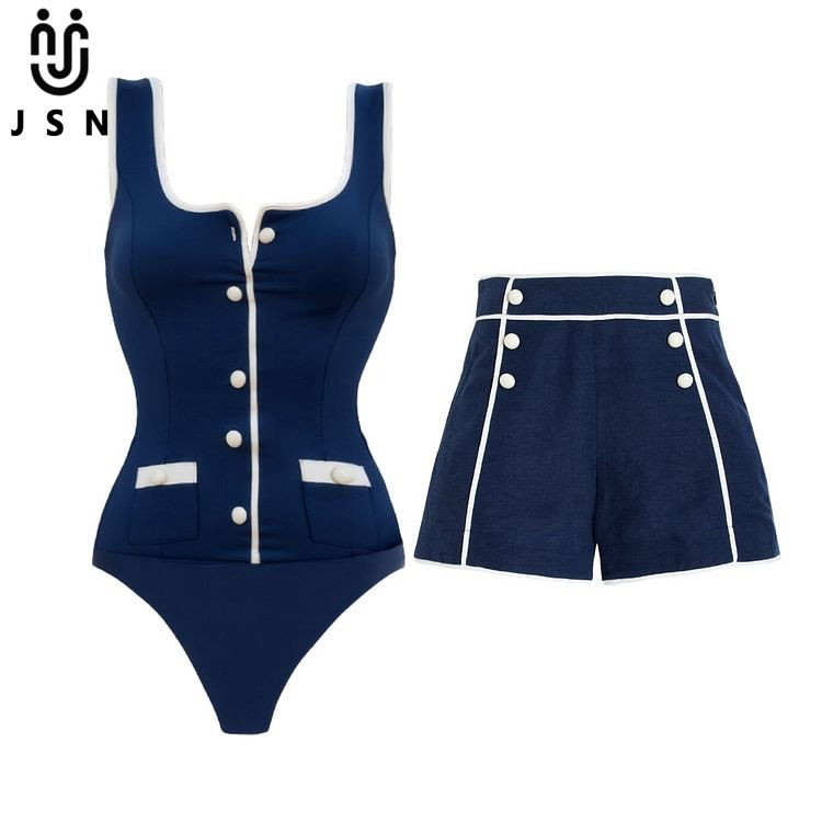 JSN 2025 nuovo Design personalizzato costume intero e pantaloncini tinta unita bottone costume da bagno donna con pantaloncini alla moda Bikini