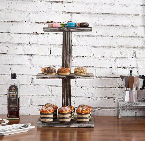 JUNJI 11.8 Inches Rustic Wood Serving Tray Budget-friendly 2-Tier Cake Stand Wedding Cake Tools Including Wooden Cake Rack