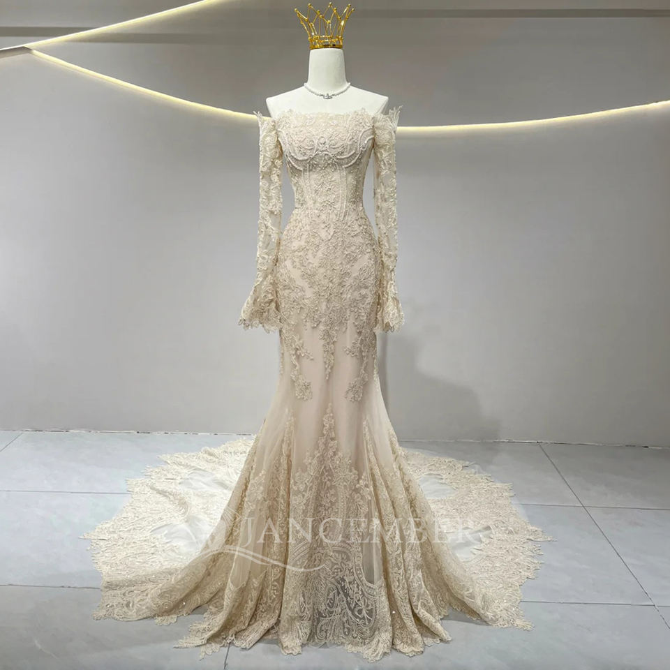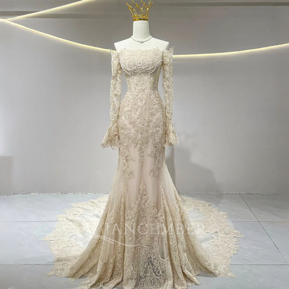 Jancember JFH16 Elegant Boat Neck champagne Slim Mermaid Lace Embroidery Wedding Dress