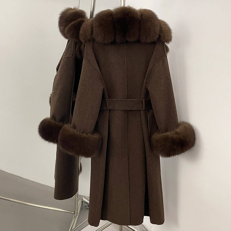 Jancoco Cappotto trench 100% lana da donna, collo e polsini in pelliccia volpe vera, con cappuccio e cintura, vari colori, 1 pz