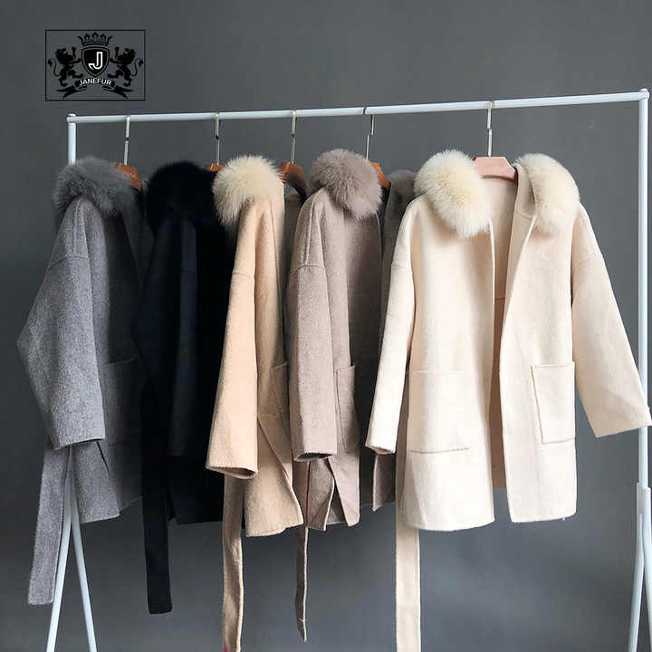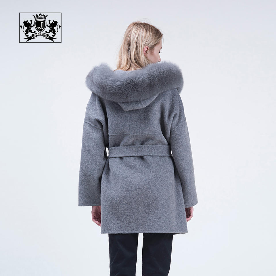 Cappotto con cappuccio in lana di lana di lunga durata Janefur in stock da donna in lana cashmere con collo in vera pelliccia di volpe