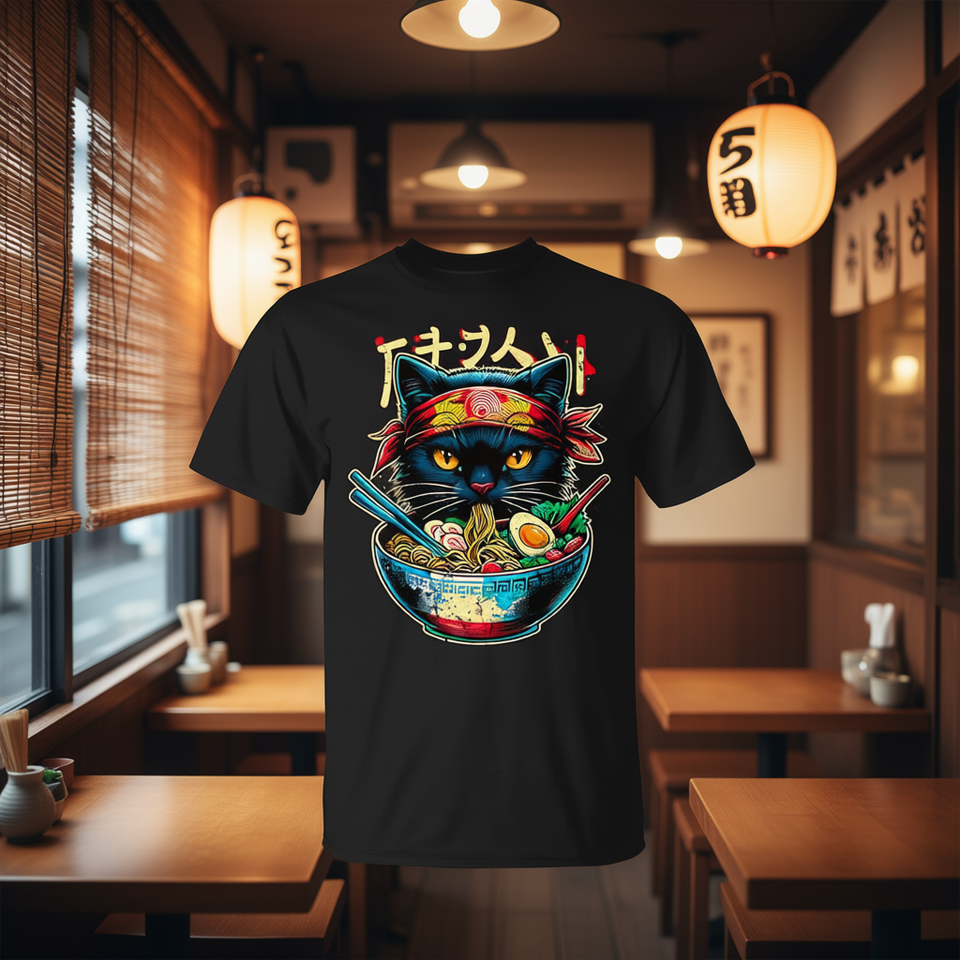 T-Shirt Unisex con Stampa Digitale Anime Giapponese Gatto e Ramen, Manica Corta, Regalo Promozionale