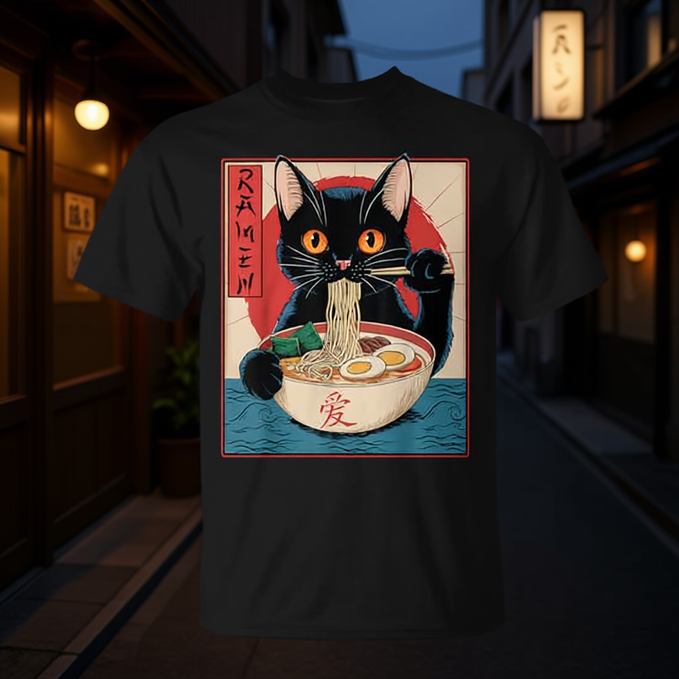 T-Shirt Promozionale con Gatto Anime Kawaii Giapponese che Mangia Ramen