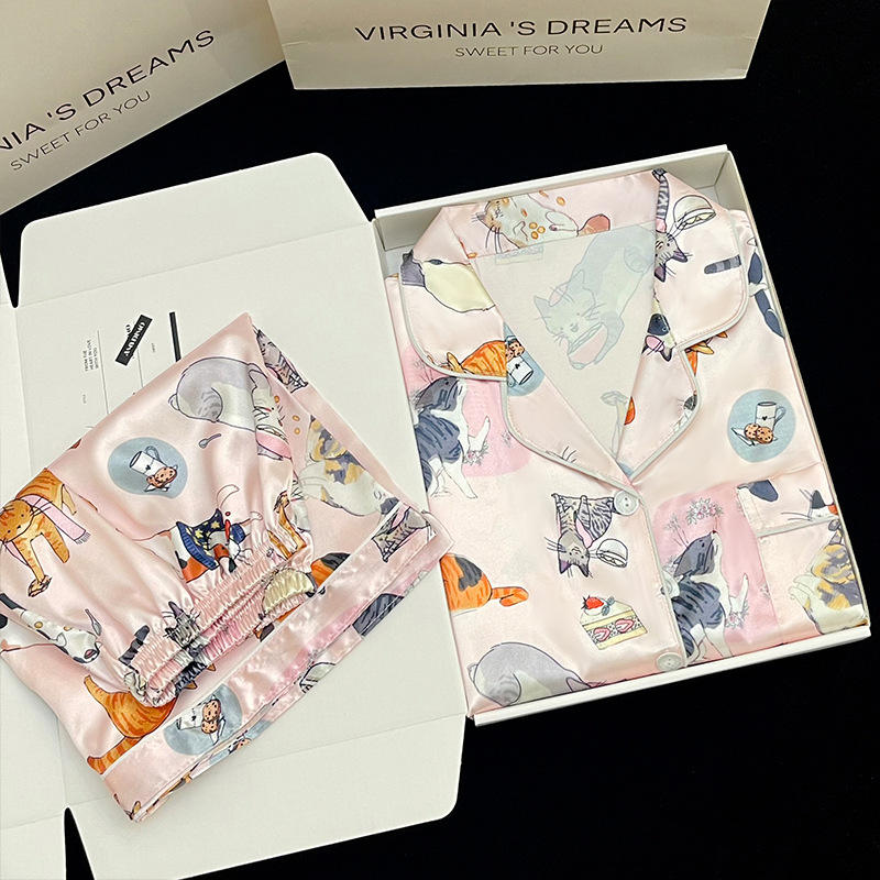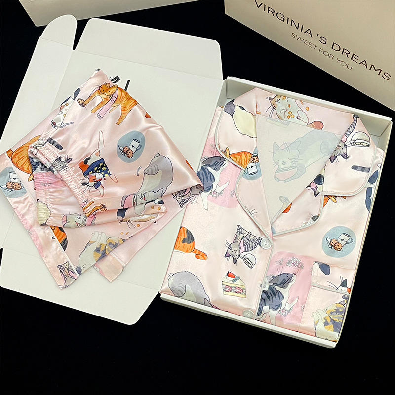 Pigiama Estivo Sottile con Stampa di Gatto Cartoonesco Giapponese, Completo da Casa per Signore con Bottoni e Maniche Corte
