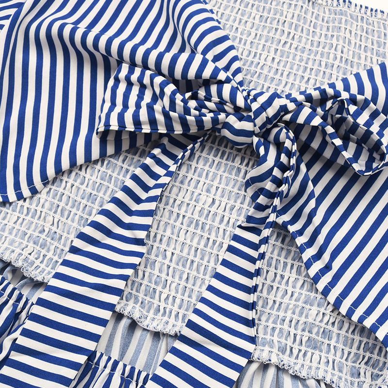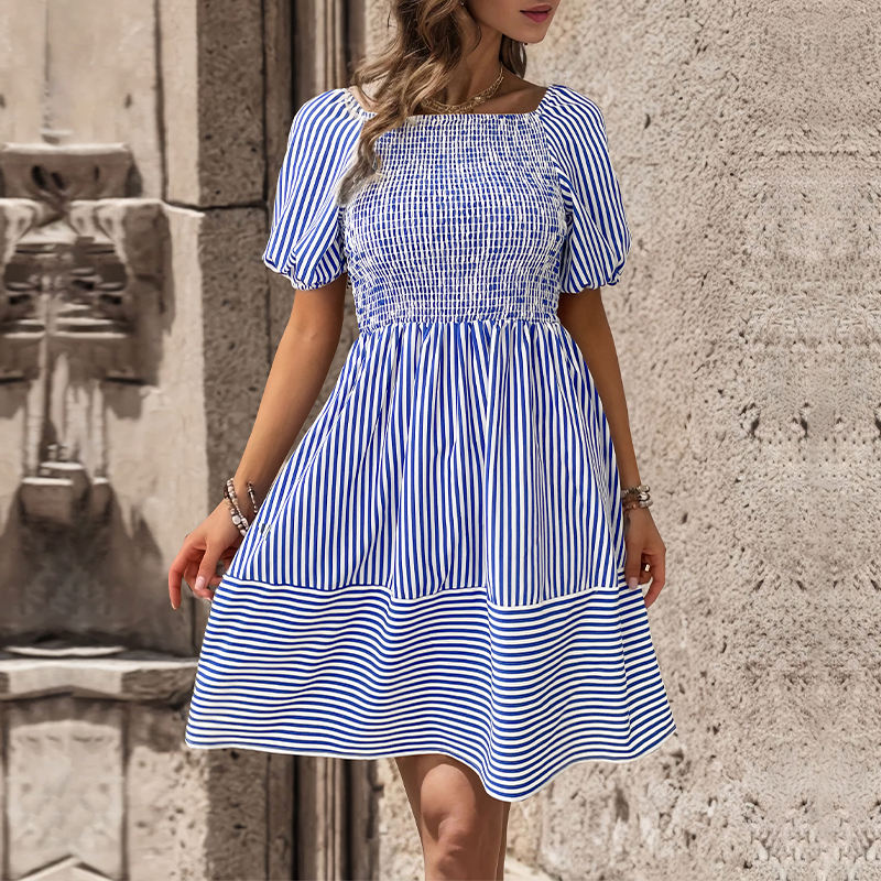 Japanese and Korean Style Blue White Striped Square Neck Short Sleeved Spring/Summer Fashionable Elegant Midi Dress