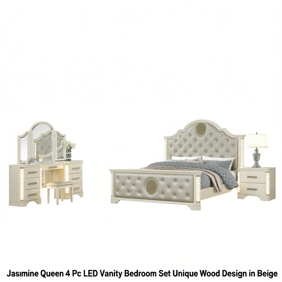 Set Camera da Letto Jasmine Queen 4 Pezzi con LED, Design in Legno Beige, Misura Queen