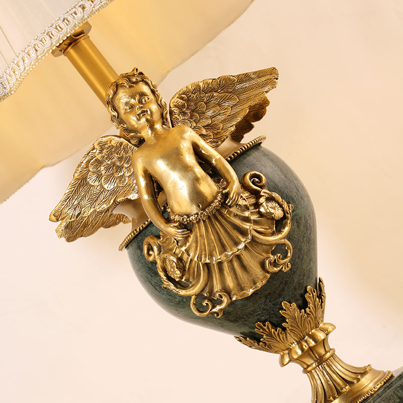 Jewellerytop European AC Antique Brass Angel Decorative Marble Base Fabric Lampshade Table Lamp for Living Room Bedroom