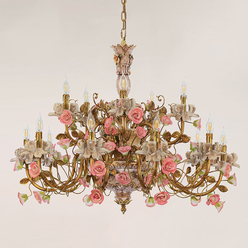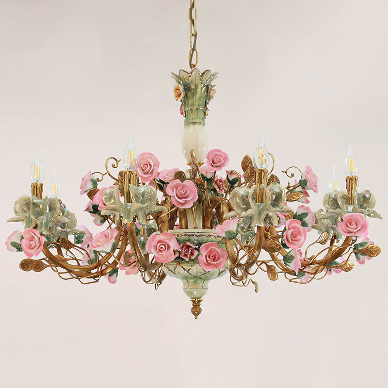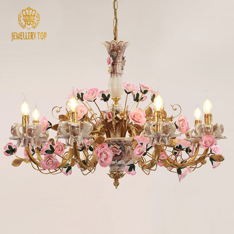 Lampada in ottone rococò francese Jewellerytop di lusso rosa fiori in ceramica a sospensione lampadario