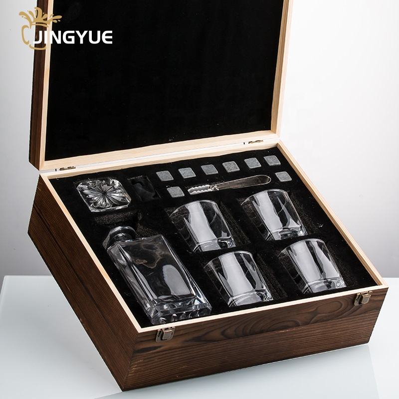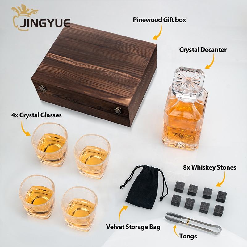Set Decanter in Vetro Quadrato da 25oz con Logo Personalizzato Jingyue, per Liquori, Vodka, Vino e Whisky, con 4 Bicchieri da Whisky in Confezione Regalo