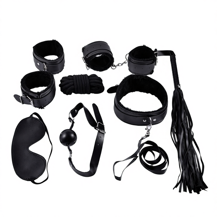 RESTRAINTS, Collar, Rope, Handcuffs, GAG, Blindfold, Whip, legcuffsIncluded Components