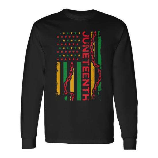 Maglietta Juneteenth con bandiera americana a maniche lunghe, girocollo nero, design promozionale unisex per adulti