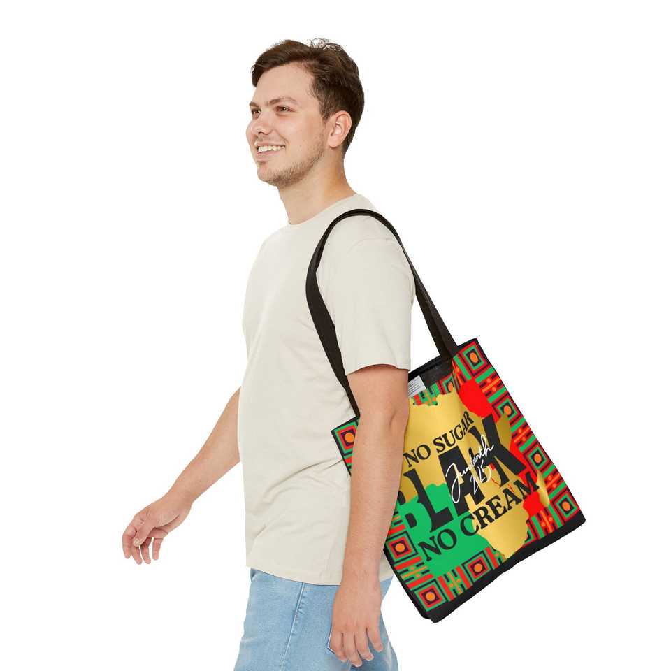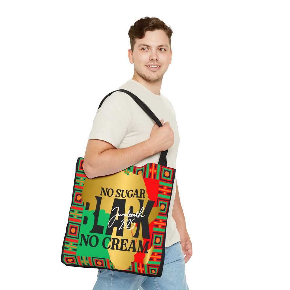 Borsa tote ispirata al Juneteenth con design 'No Sugar Black No Cream', in tela con cerniera, portatile ed elegante, con fodera in poliestere