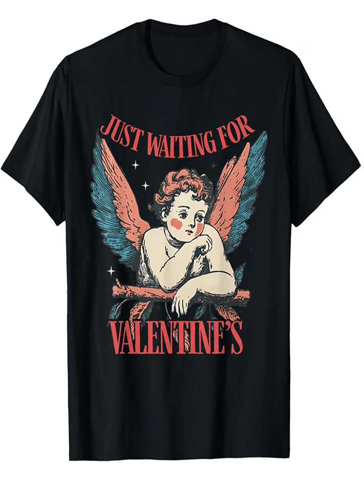 Just Waiting For Valentine's Cupid T-Shirt Black 100% Cotton Men's Casual Valentine's Day Gift Short Sleeve Regular Fit