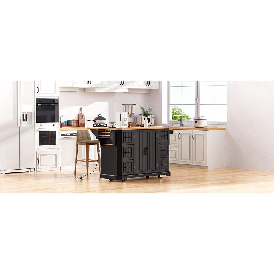 Isola da Cucina K K da 56 Pollici con 4 Ripiani, Presa di Corrente, Strisce Verticali in Rilievo, Piano Ribaltabile in Impiallacciatura di Legno di Gomma