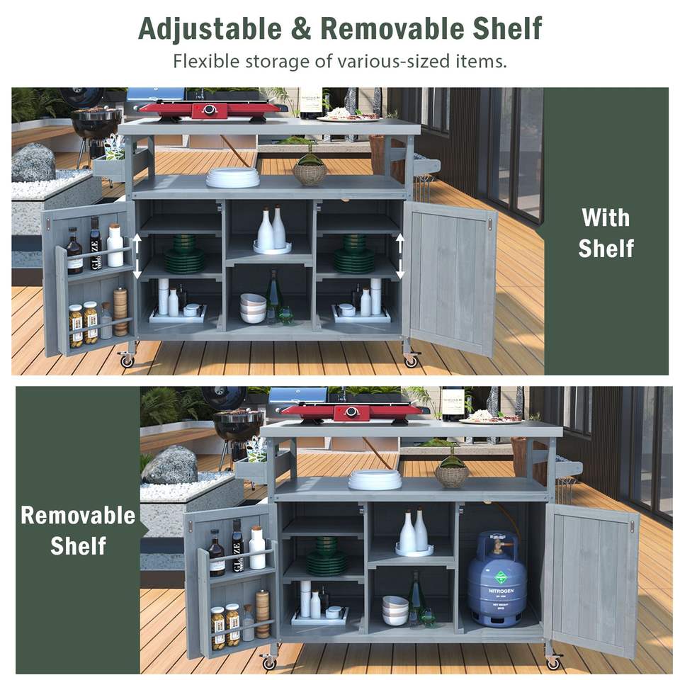 K&K Outdoor Kitchen Island Farmhouse Style Rolling Bar Cart Stainless Steel Top Solid Wood Storage Cabinet BBQ Grill Table Spice