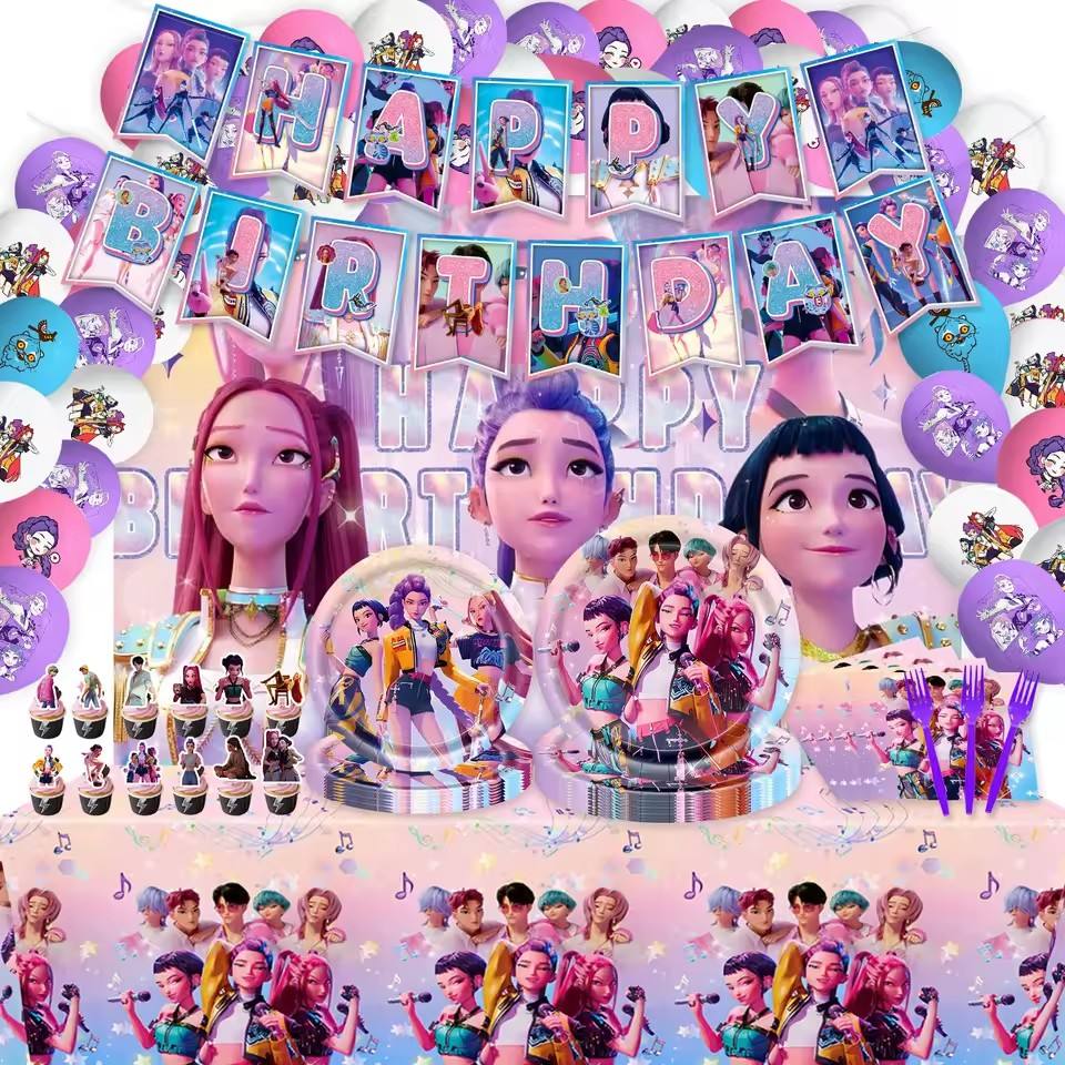 Articoli per Feste di Compleanno a Tema Gruppo Femminile K-POP Cartone Animato Cacciatrice di Demoni Anime Striscione Buon Compleanno Piatti di Carta Forniture per Halloween e Pasqua