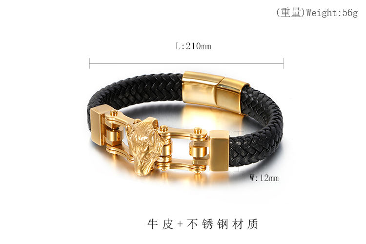 KALEN nero in vera pelle intrecciata corda oro acciaio inossidabile lupo bracciale uomo