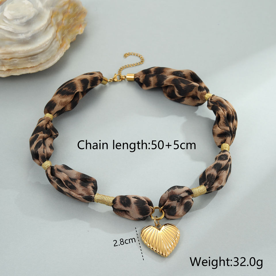 KITI Trendy Leopard Print Fabric Necklace with PVD 18K Gold Stainless Steel Heart Pendant Necklace Waterproof Jewelry