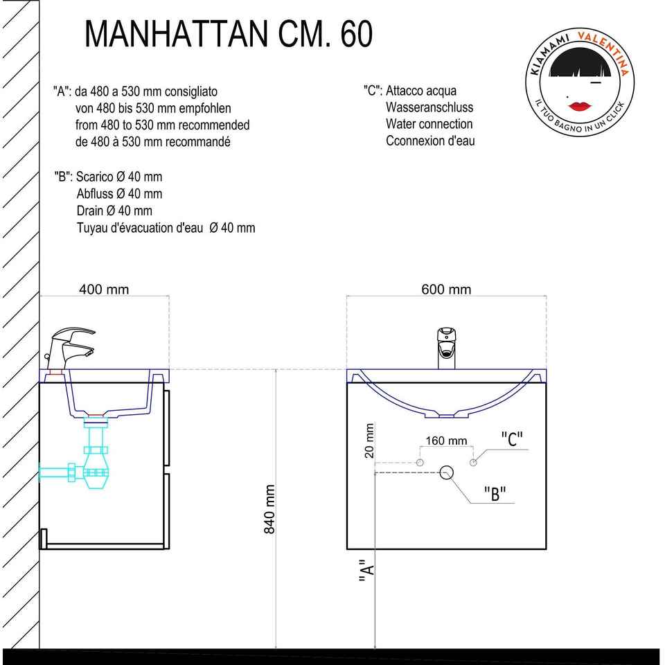 KORICINI Miami Forest White 60cm Set Moderno di Mobili da Bagno a Parete in Legno, Due Pezzi, Rettangolare, Made in Italy
