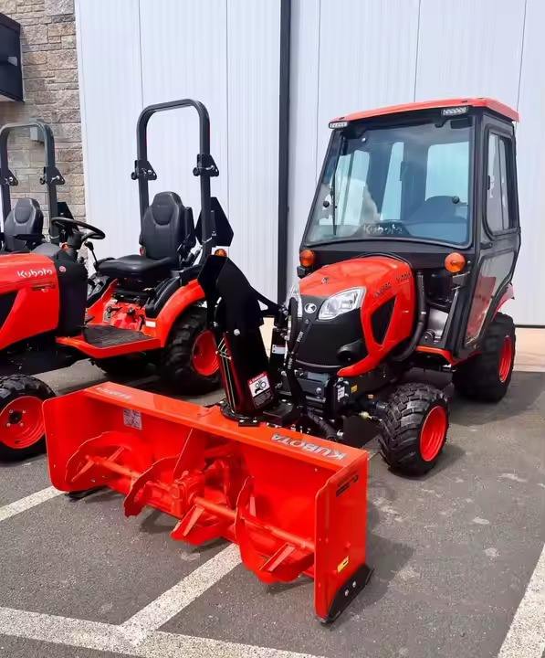 Trattore usato KUBOTA con spazzaneve montato sulla parte anteriore e ponte di falciatura a montaggio centrale