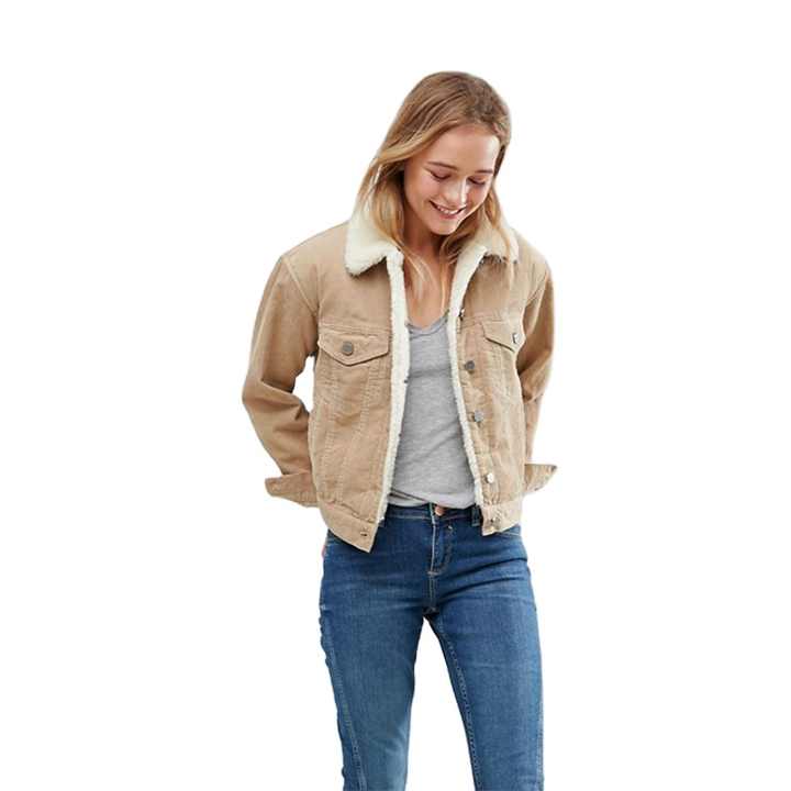Giacca Invernale in Velluto a Coste KY con Colletto Spalmato, Bottoni, Tasche Funzionali e Collo in Pile, Colore Pietra