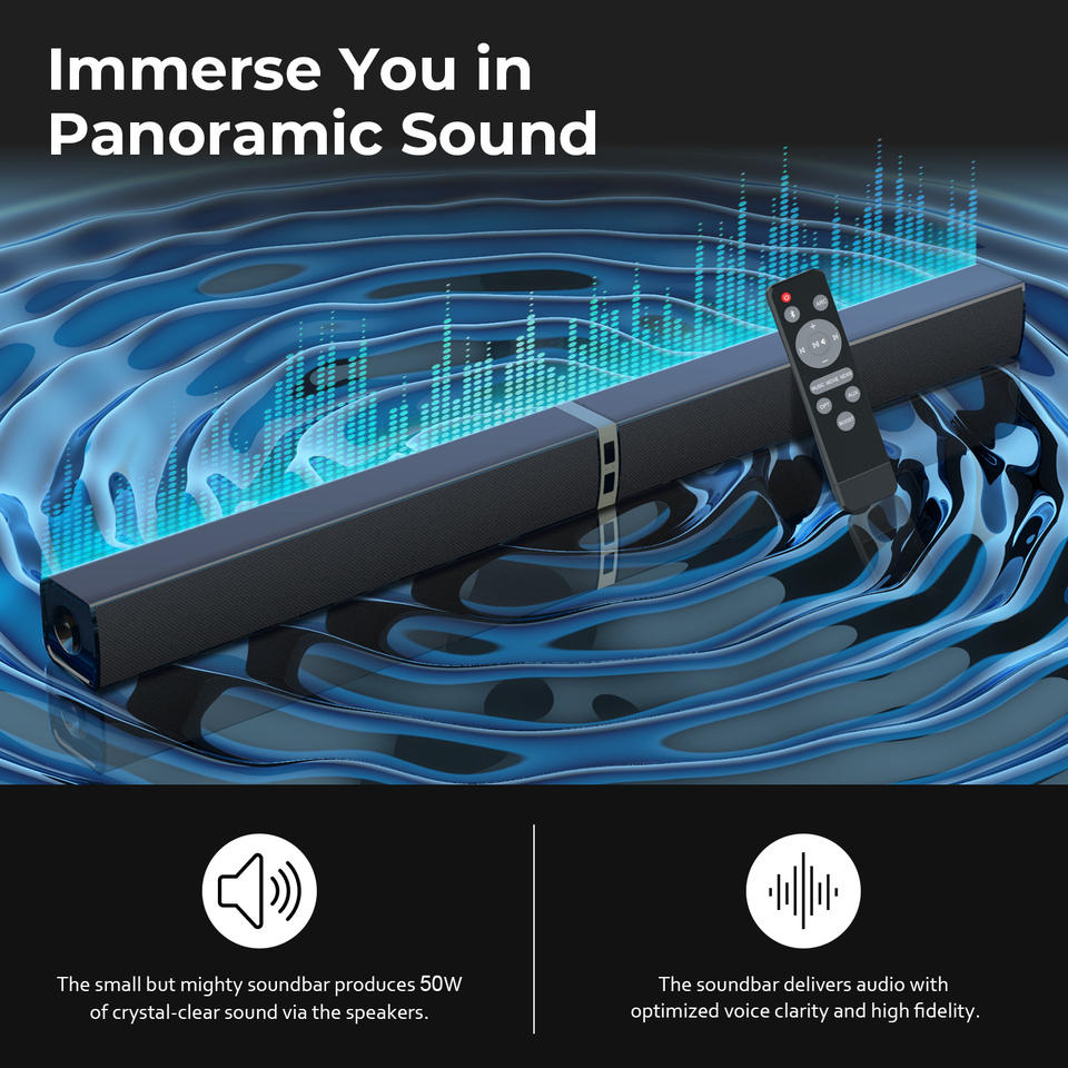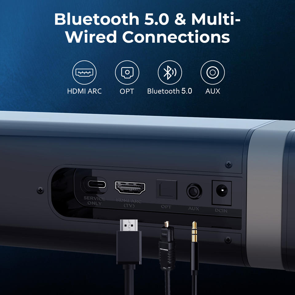Connessioni multiple: Supporta Ottica, HDMI-ARC, AUX e Bluetooth 5.0, garantendo la compatibilità con un'ampia gamma di dispositivi.
