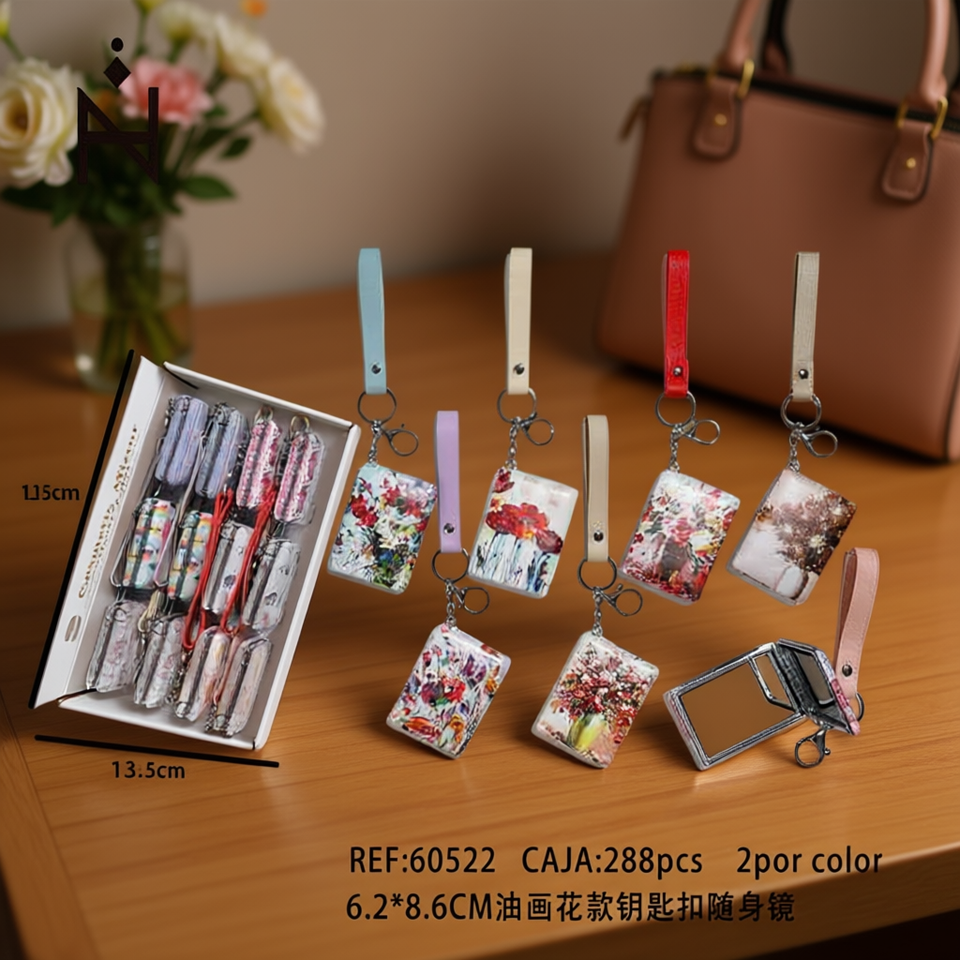 KZ Oil Painting Flower Keychain 6.2x8.6cm Portable Mirror With Strap For Women Gift