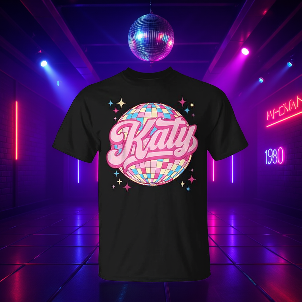 T-shirt Katy personalizzata in stile retrò disco anni '80, taglia unisex per adulti