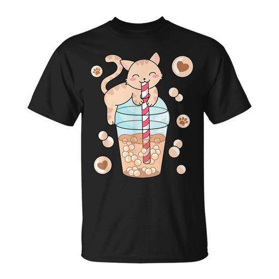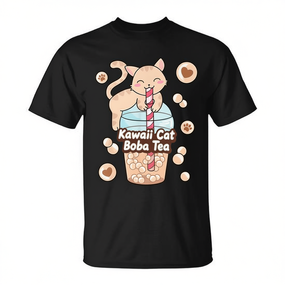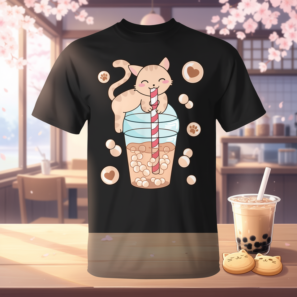 T-Shirt Promozionale Anime Giapponese Kawaii con Design di Gatto e Bubble Tea