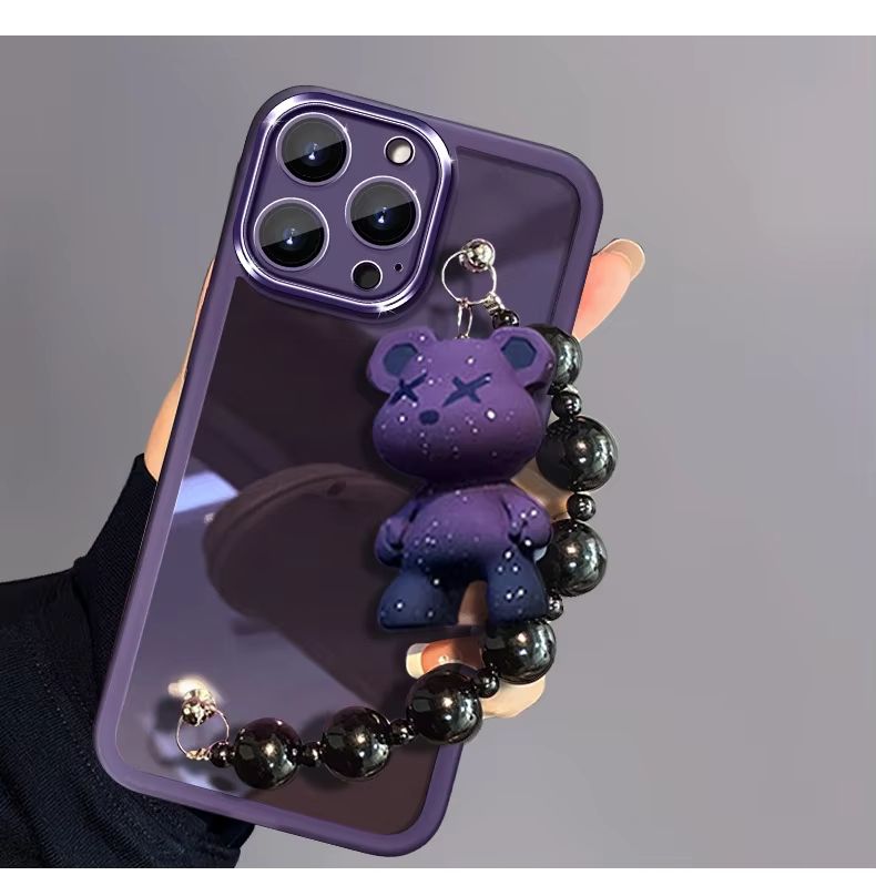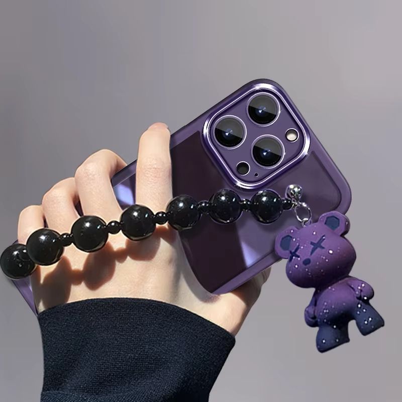 Kawaii Purple Bear Charm Phone Case with Black Beaded Chain for iPhone 17/16/15/14/13 Pro Max Translucent Shockproof Cover