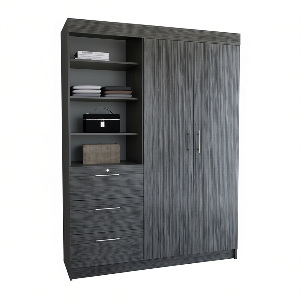 Armadio Kenya a 3 cassetti e doppia anta in rovere fumé con 3 ripiani, mobile per camera da letto