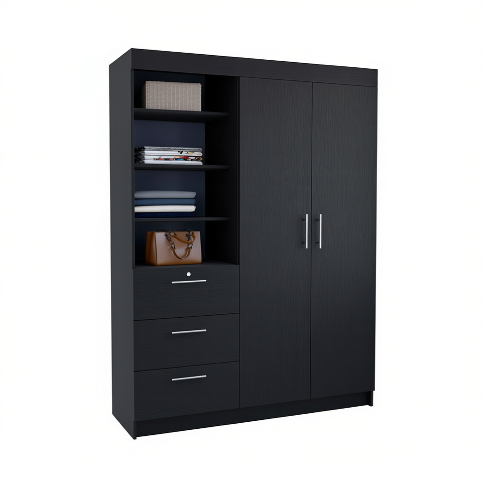 Armadio Kenya a 3 cassetti e doppia anta, nero, moderno, per camera da letto, con 3 ripiani e maniglie in metallo
