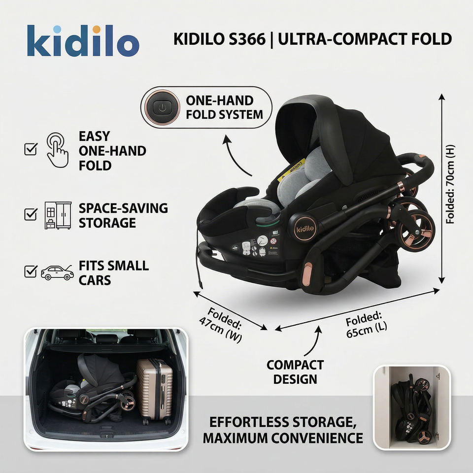 Kidilo S366 Passeggino 3 in 1 con Seggiolino Auto Pieghevole per Neonati, Carrozzina Compatta per Bambini