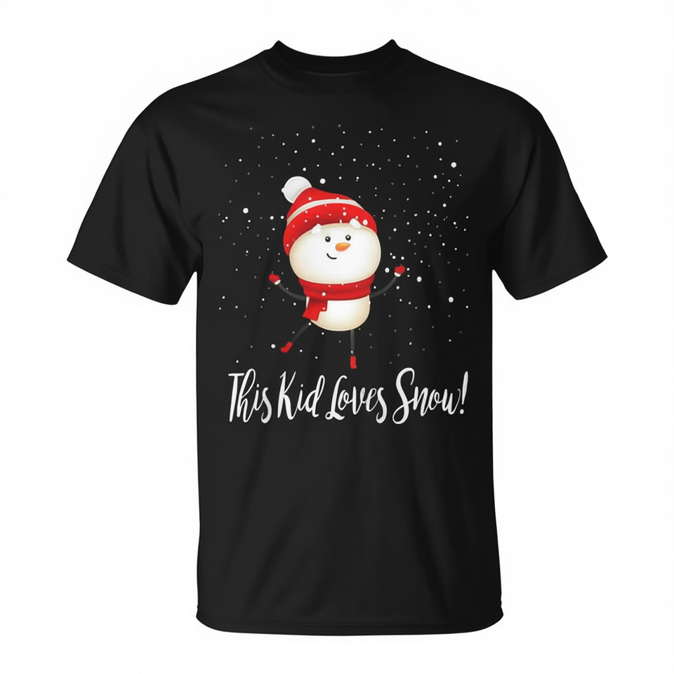 T-shirt per bambini con pupazzo di neve danzante. Questo bambino adora la neve. Maglietta per le vacanze di Natale