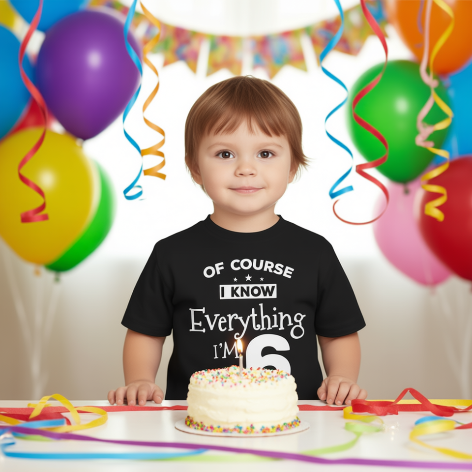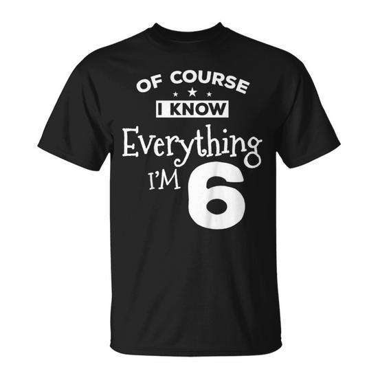 T-shirt per bambini per il 6° compleanno, manica corta, girocollo, unisex, serigrafata, con stampa Everything I Know I'm 6