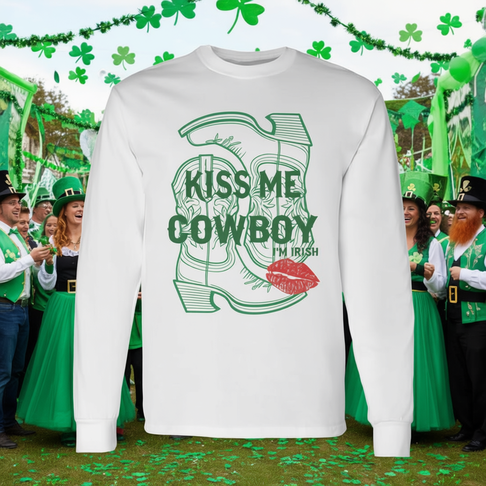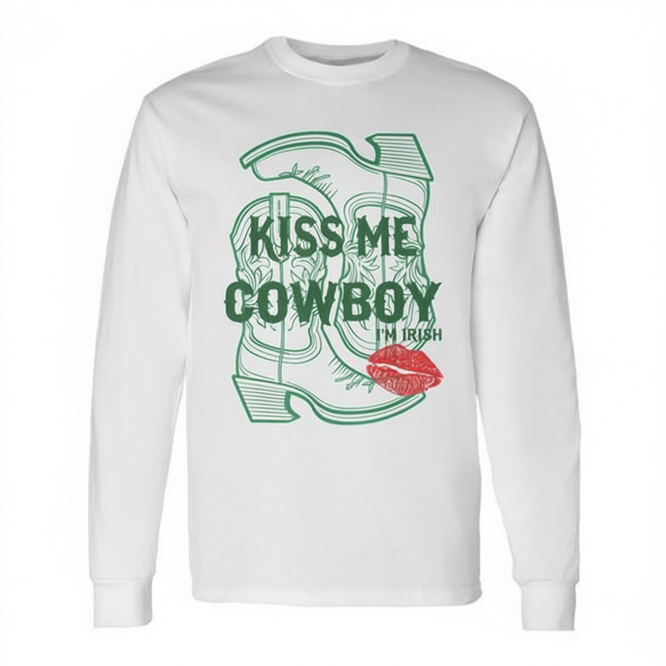 T-shirt a maniche lunghe Kiss Me Cowboy I'm Irish con design stivale verde, maglietta per la festa di San Patrizio, girocollo unisex per adulti