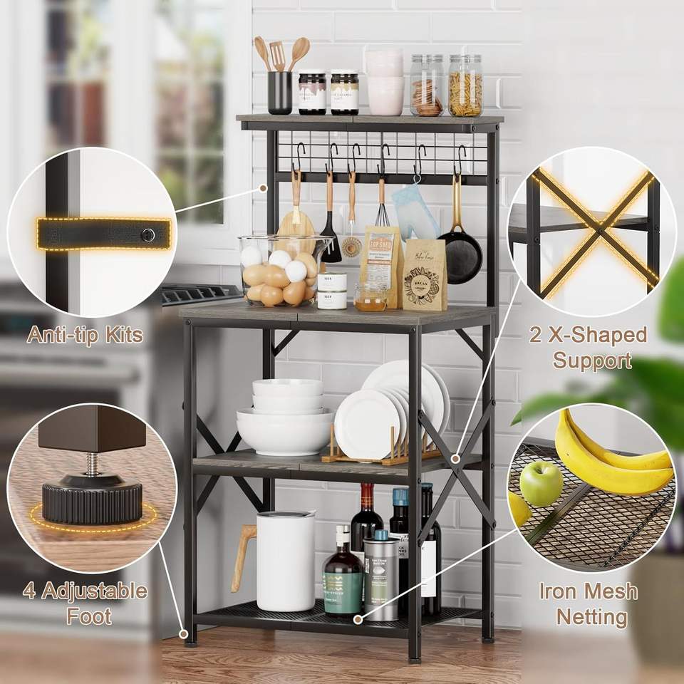 Scaffale da Cucina a 4 Livelli per Microonde con Spazio di Archiviazione, Stazione Caffè con 6 Ganci a S e Mensole a Scala con Pannello Forato