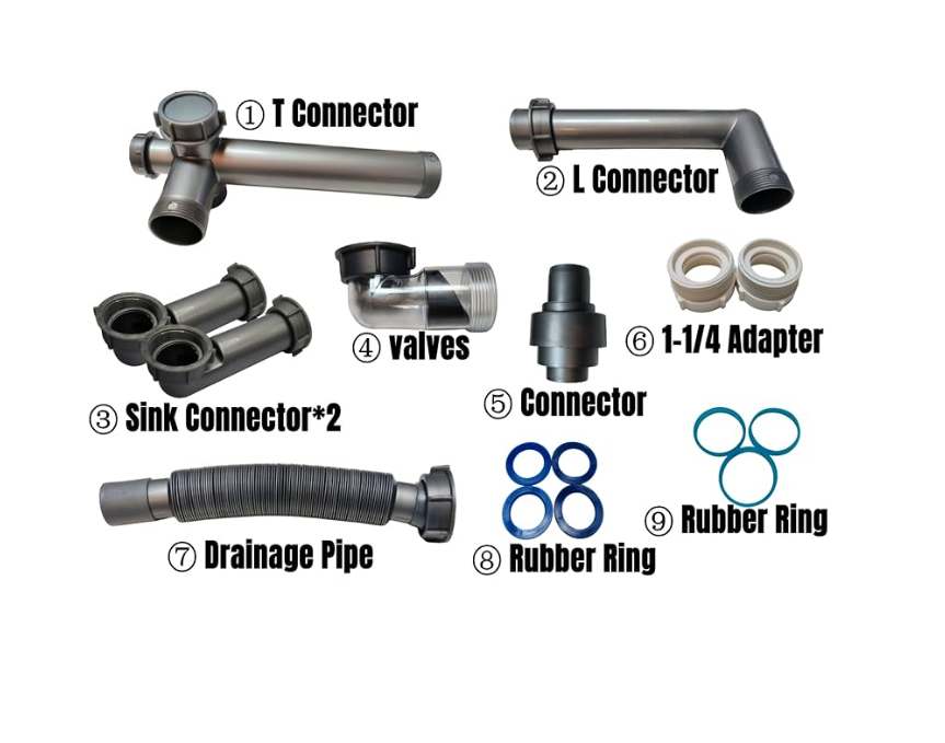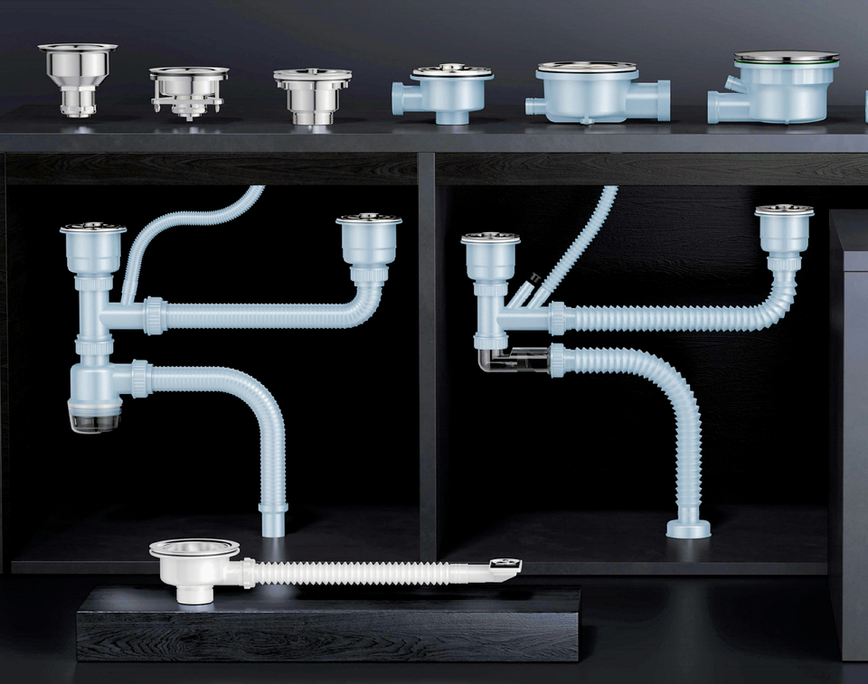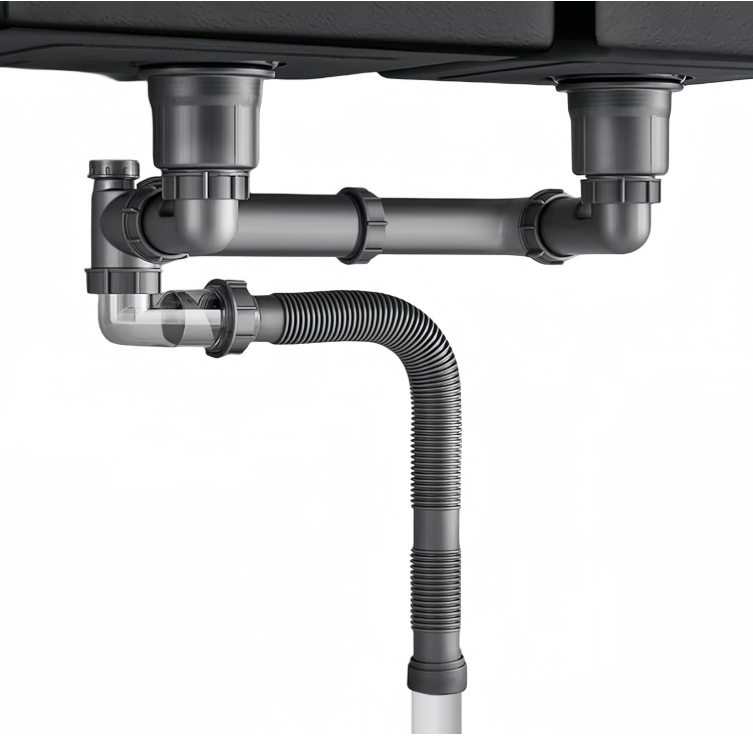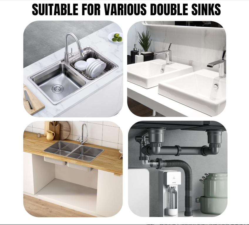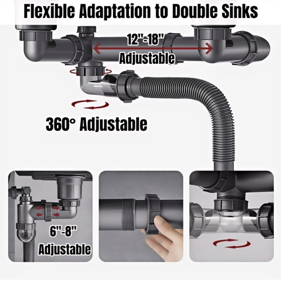 Kit di Scarico Flessibile Espandibile per Lavello da Cucina 1 1/2" e 1 1/4" Tutto-in-Uno per Lavello a Doppia Vasca, Design Salvaspazio