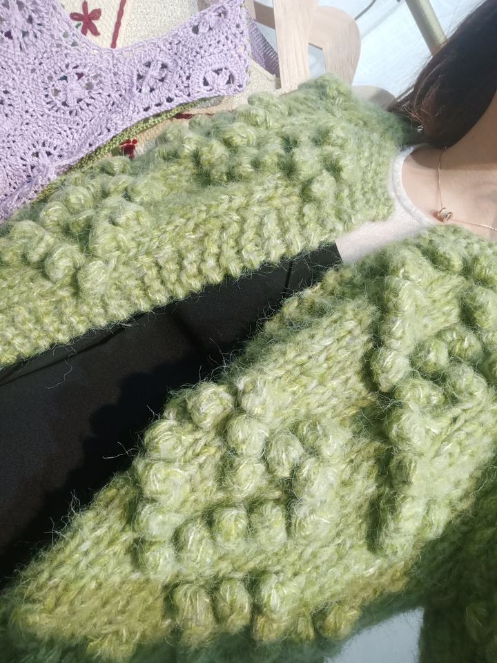 Cardigan aperto con pompon lavorato a maglia, morbido Cardigan a forma di cuore da donna, lavorato a mano, grosso Cardigan oliva