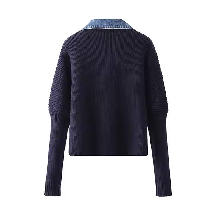 Knitwear Manufacturer Custom Dark Blue Polo Collar Denim Splice Single Breasted Korean Knitted Women Custom Sweaters Cardigan