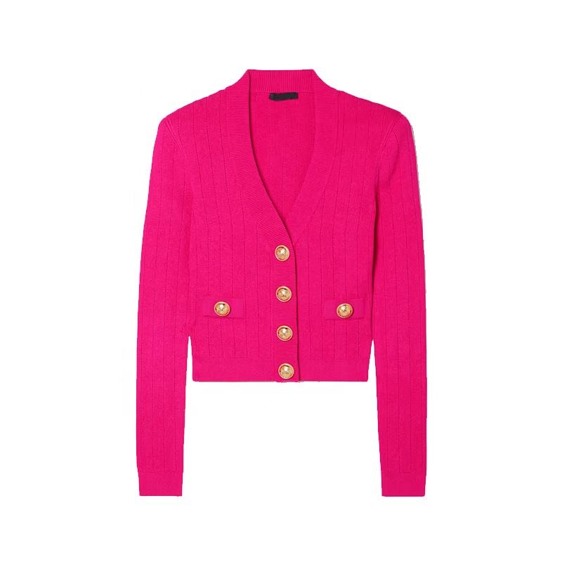 Knitwear Manufacturers Custom Autumn Winter Black v Neck Long Sleeves Gold Button Ribbed Knit Women's Cardigan Sweater