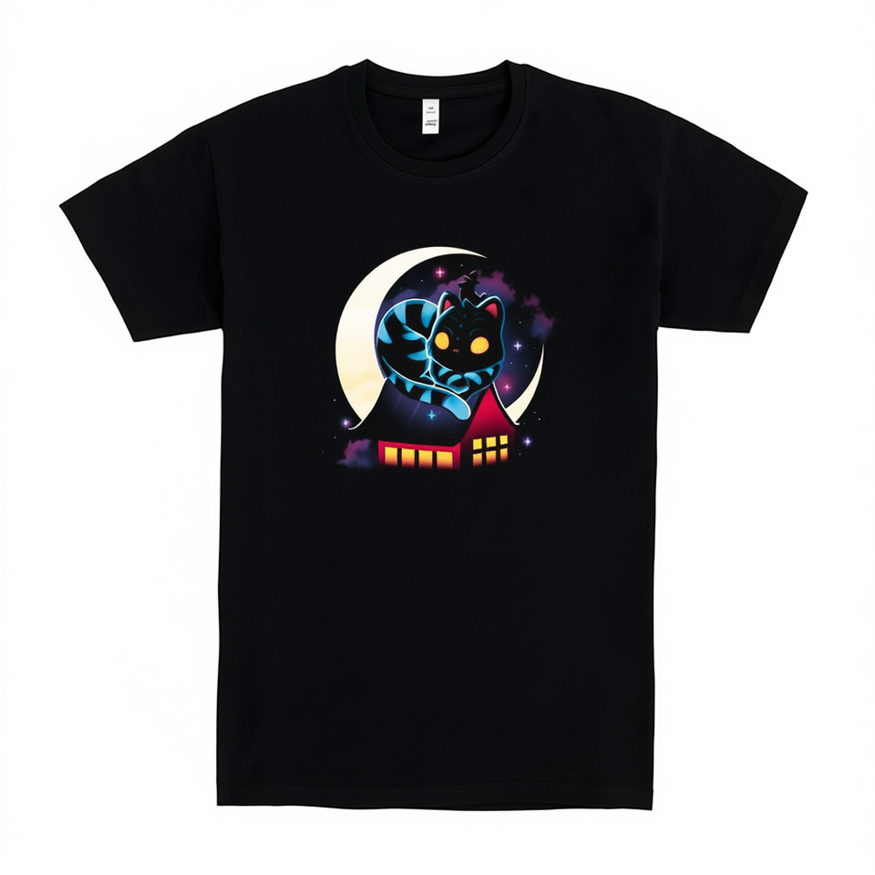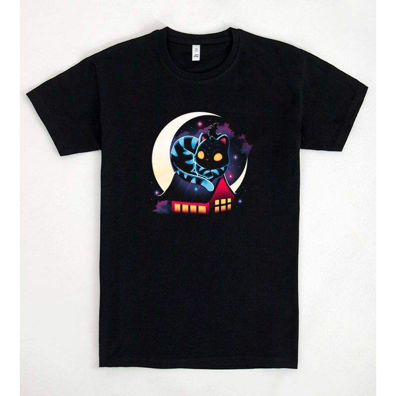T-shirt nera coreana con design di gatti, luna e stelle per uomo e donna, abbigliamento unisex